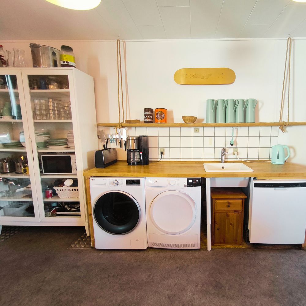 - The køkken med vask, tallerkner, bestik, gryder, køkkenudstyr og Køleskab.