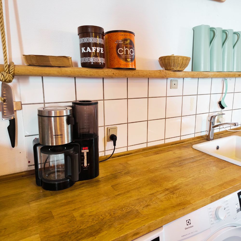 - Te-køkken udstyret med tallerkner, bestik, gryder, køkkenudstyr og køleskab
